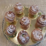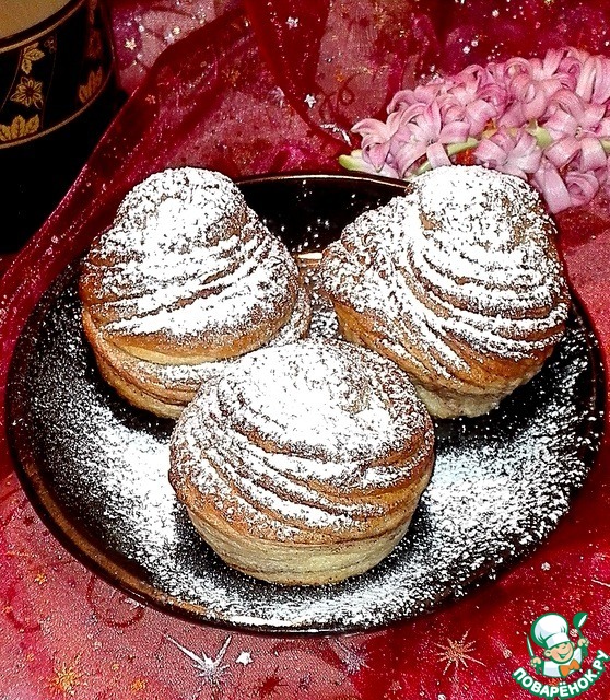 Выпечку вынула из ячеек, переложила в тарелку и обсыпала пудрой.