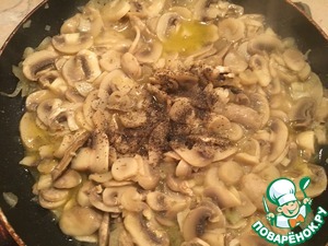 • Теперь берём грибы и лук, режем, снова обжариваем на сливочном масле, соль и перчик по-вкусу