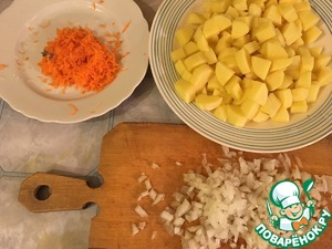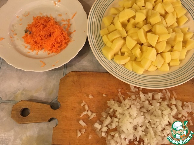 Картофель, лук и морковь нарезаем и кладём в кастрюлю (у меня 3 л)