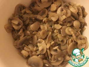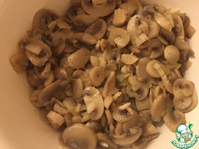Пока овощи варятся мы нарезаем луковицу и грибы, обжариваем, в конце жарки добавляем немного перца и соли.