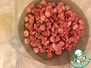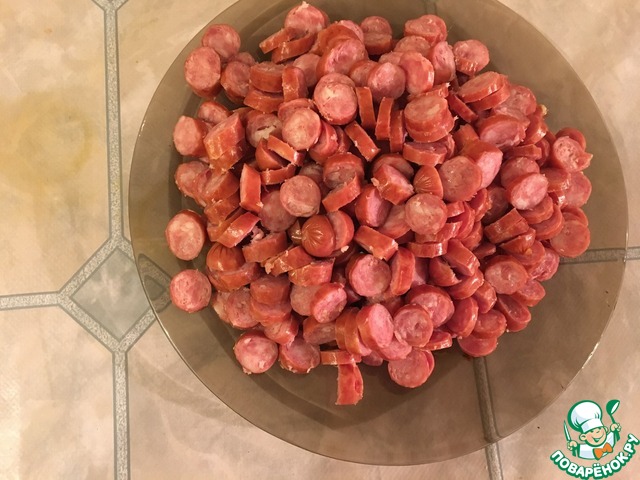 Затем нарезаем сосиски маленькими кружочками.