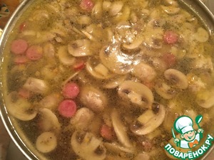 Когда начнёт кипеть, кладём в кастрюлю грибы и сосиски.