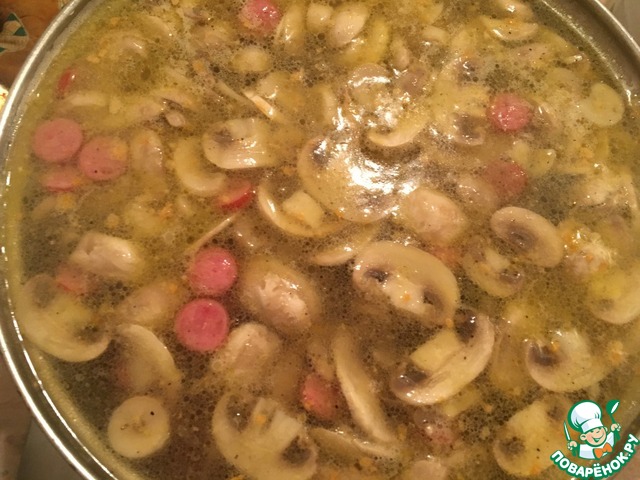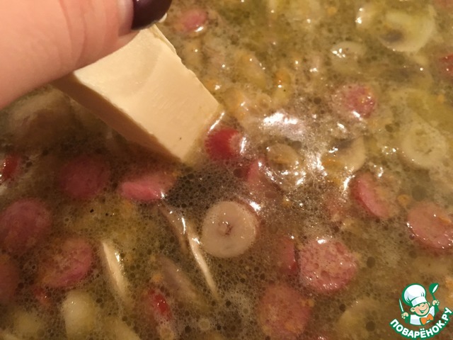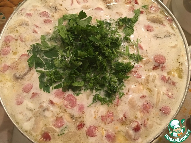 Рецепт «Сырный суп с копчёными сосисками»: