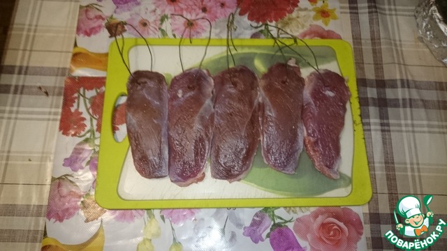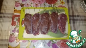 Берем утиные грудки без шкурки. Я покупал в магазине уже готовые.