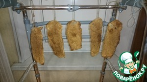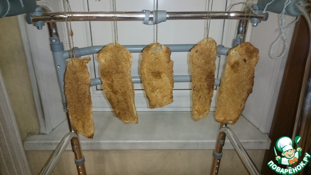 Теперь чисто технические вещи. Я сушу бастурму на лоджии летом (в тени) или в комнате зимой. Перед обмазкой приготовьте палочку на которой будут висеть грудки.