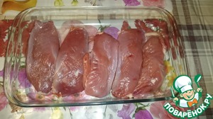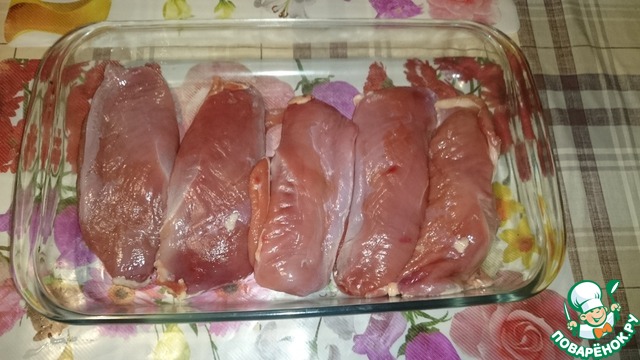Строение у них почти такое же как и у куриных. Есть большой кусок и маленькая полоска мяса. Эту полоску отрываем, очень легко отделяется, потом можно их (5 шт) пожарить. Жир и пленки лучше удалить. Складываем грудки в подходящую, лучше стеклянную посуду. -