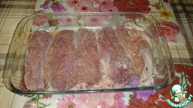 Натираем грудки солью, закрываем посуду фольгой и в 0 камеру холодильника на 2 дня. Каждый вечер сливаем образовавшийся сок и переворачиваем грудки.