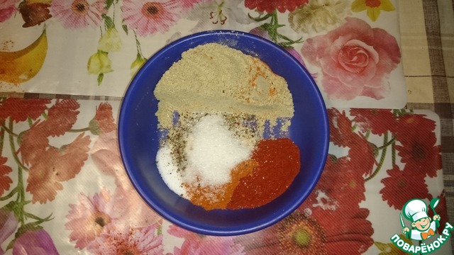 Я иногда добавляю немного соли и обычно смесь перцев. Во многих рецептах пишут, что мясо после засолки нужно промывать. Я так не делаю. Поэтому соли в обмазку добавляю очень немного.