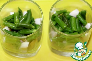 Стручковую фасоль отварить (2-3 минуты после закипания) с добавлением чеснока, который потом удалить.
