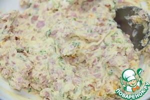 К ветчине добавить творожный сыр, измельченный зеленый лук, желтки сваренных заранее яиц, приправить солью и перцем.