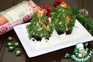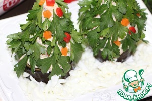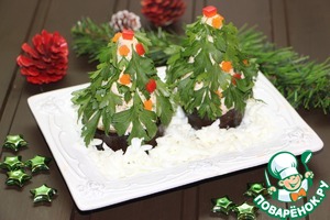 Елочки поставить на тертый белок двух вареных яиц - пушистый снег. У петрушки оборвать листочки, при их помощи сделать подобие иголочек (листочки легко крепятся на сырную массу)