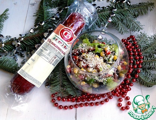 Как известно год Петуха приносит прибыль и деньги в достатке. Чтобы ублажить и прикормить горделивого и характерного петуха надо обязательно приготовить на праздничный стол этот салатик. Зерна кукурузы и фасоли, семечки кунжута-все что любит петушок, а в сочетании с зеленью, овощами и сырокопченой колбаской салат порадует и ваших гостей изысканным и ярким вкусом. Не смотря на то, что салат сытный, он совершенно не тяжелый, так как отсутствует майонезная заправка. Угощайтесь!