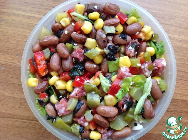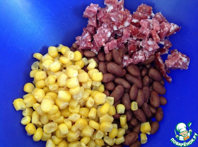 В салатник выложить отварную фасоль, кукурузу ( предварительно слить с банки лишнюю жидкость). Колбасу очистить и нарезать маленьким кубиком.