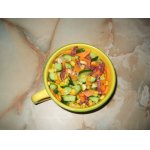 Болгарский перец нарезать небольшим кубиком как и огурец. Листья базилика измельчить. Листья салат нарвать руками или нашинковать. Добавить семена кунжута.