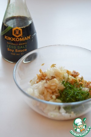 Приправьте соевым соусом "Киккоман" и оставьте мариноваться на 1 час.