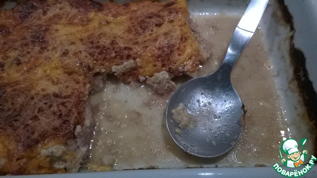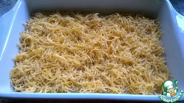 • В духовку, разогретую до 170-180 С на 40 минут до запеченного сыра. Можете наблюдать, что все будет вариться в соку. Мясо съежится, что можно видеть на картинке. Я передержала слегка и сыр потемнел.