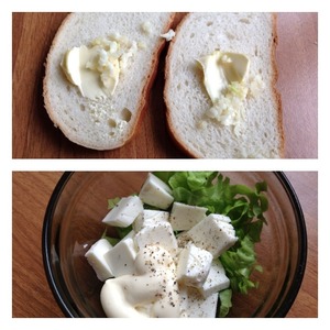 На кусочек батона выложить масло комнатной температуры и чеснок пропущенный через пресс. Ложкой перемешать масло с чесноком и размазать по батону. Отправить ломтики батона в духовку на 10-15 мин при 180 гр. Тем временем сделаем пасту-намазку. Листья салата порвать руками или нарезать, добавить молотый перец, майонез и плавленый сырок. Пюрировать блендером до однородной консистенции.
