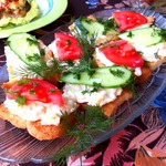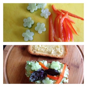 Болгарский перец нарезать тонкой соломкой, огурцы кружочками или вырезать фигурки вырубками. На горячие батончики намазать сырную намазку. Сверху уложить перец, огурчики и листики базилика.