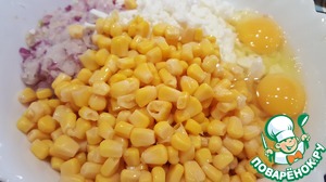 Отварить вермишель. Пропустить колбасу через крупную сетку в мясорубке, также пропустить лук и чеснок. Добавить консервированную кукурузу, яйца, натёртую моцареллу и отварную вермишель.