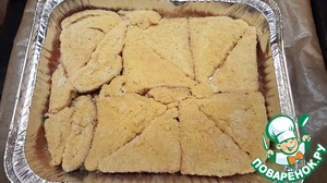 Смешать молоко с яйцом. Ломтики хлеба быстро окунать с обеих сторон в смесь, затем в панировочные сухари и выкладывать в смазанную маслом форму для запекания. Если получатся пустоты, заполнить их кусочками хлеба.
