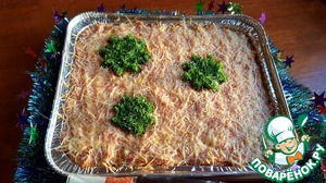 Достать пирог из духовки, чуть вдавить в поверхность металлические вырубки для печенья, хорошо бы с Новогодней тематикой. Весь пирог, кроме вырубок, посыпать пармезаном. Отправить пирог в духовку на 5-10 минут для запекания сырной корочки.