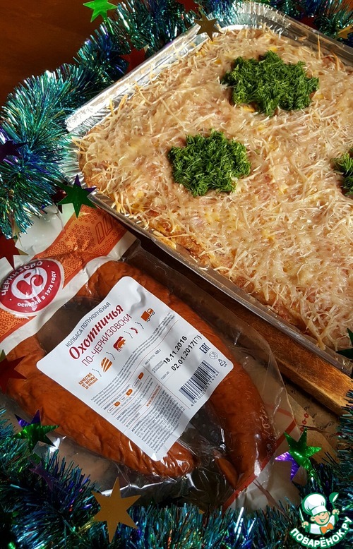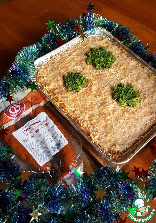 Открытый пирог-запеканка быстрого приготовления, легко заменяемые ингредиенты, яркий вкус и внешний вид однозначно порадует Вас и Ваших гостей, даже если они "на пороге"! Особенный подкопчённый вкус пирогу придаёт колбаса полукопчёная "Охотничья по-Черкизовски"! Хороших Вам Новогодних посиделок!