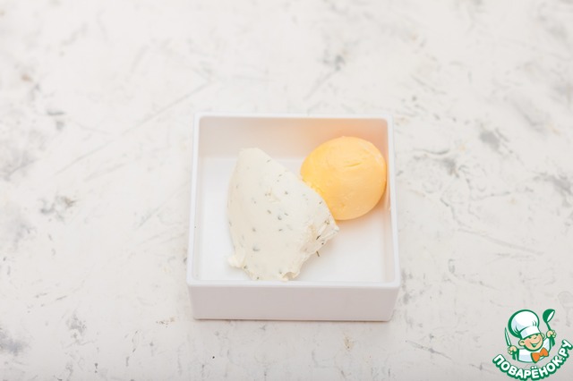 Сливочный сыр (у меня с зеленью) растереть с вареным желтком. -