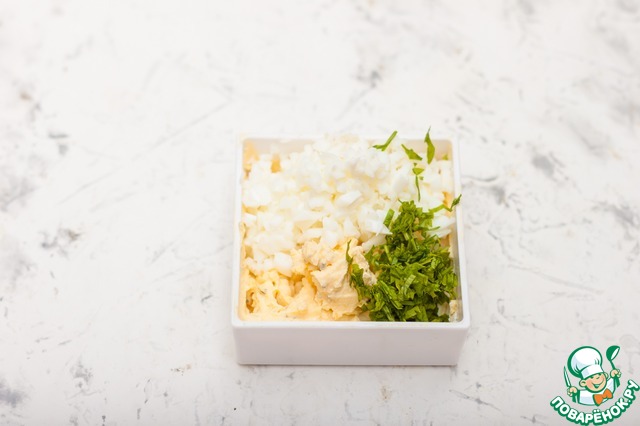 Добавить мелко нарезанные белки и зелень, перемешать. Можно поперчить. Солить не надо.
