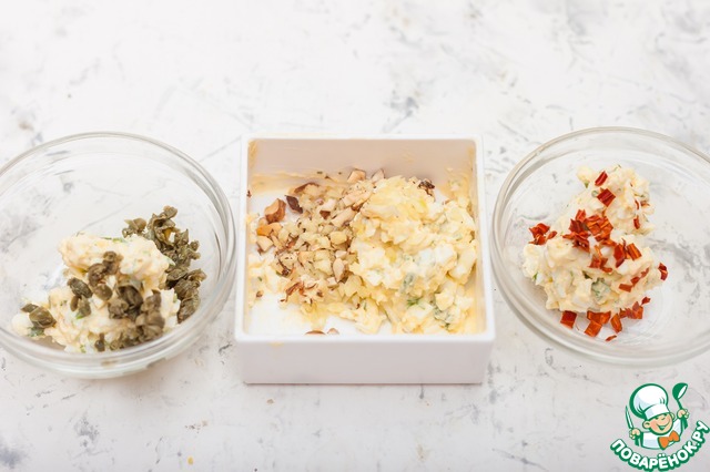 Разделить сырную массу на 3 части, в одну добавить каперсы, в другую - чеснок с орехами, в третью - чили.