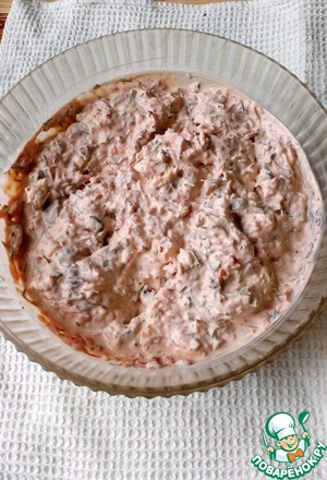 Болгарский перец и 45 г маслин (1/4 стакана) измельчить. Не измельчайте в кашу, лучше очень мелко нарезать. Если все таки будете пользоваться измельчителем - после выложите на сито, чтобы стекла жидкость.