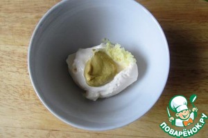 В мисочку выкладываем майонез, добавляем горчицу и пропущенный через пресс чеснок.