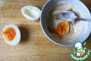 Яйца очищаем и разрезаем вдоль пополам. Желтки добавляем в заправку. -