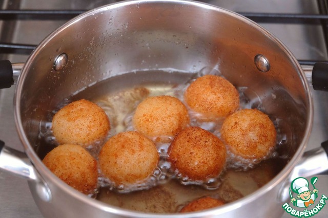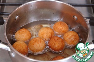 Масло в емкости для обжарки должно покрывать шарики на 1/2. -