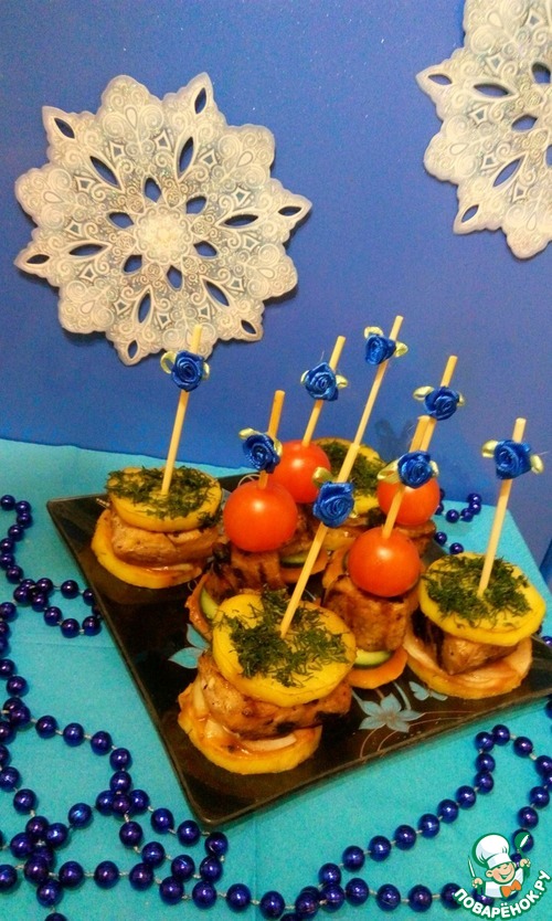 Теперь кладем мясо, которое 2*2, и закрепляем шпажкой с помидором.