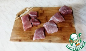 Итак начнем с мяса. Режем его половину кусочками 4*4 а вторую половину 2*2. -