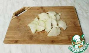 Лук нарезать полукольцами и замариновать любимым Вашим способом. Я делаю так: на 250 мл холодной кипяченой воды кладу 4 ст. л уксуса, 1 ч. л соли, 3 ст. л сахара. В холодильник на 30 минут, а затем промываю холодной водой.