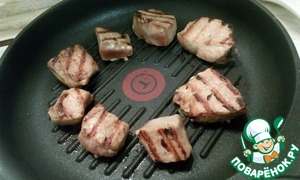 Пришло время жарить мясо. Сковороду-гриль нагреть и выложить на нее мясо. Маринад не выливать он еще будет нужен. Жарить около 4 минут со всех сторон. Не пересушите.