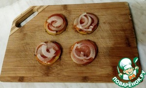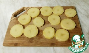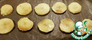 А пока жарится мясо, нарезать остывший картофель кружочками по 0,5 см. Силиконовой кисточкой смазать одну сторону картофеля маринадом от мяса.