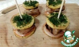Теперь кладем мясо, которое 4*4, накрываем картофелем, закрепляем шпажкой. Сверху посыпать мелко резанным укропом.