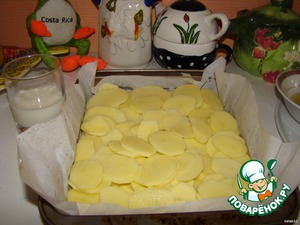 Очищенный картофель режем ломтиками, выкладываем на застеленный пергаментной бумагой противень, заливаем молоком (лучше сливками).