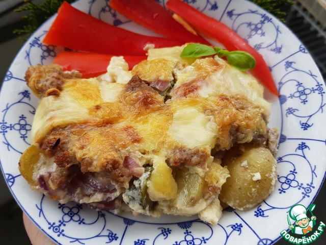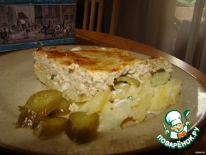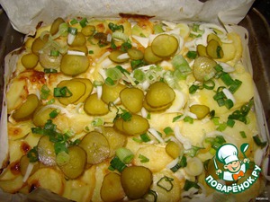 Достали наш полуготовый картофель, посыпали луком и ломтиками соленого огурца.