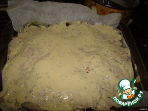Намажем майонезом и отправим в духовой шкаф на 25 минут. Запекаем при температуре 200 С. -