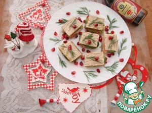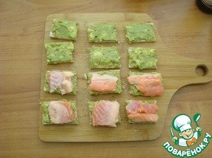 Режем их на прямоугольники. На 6 кусочков. Поверх выкладываем рыбу.