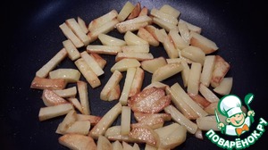 Пока рыба закипает, обжариваем до золотистой корочки, но не до готовности, картошку на сковороде. Имменно она, обжаренная "спрячет" "рыбный дух".