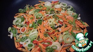 Теперь обжариваем на оливковом масле овощи: нарезанный кольцами порей, соломкой морковь, колечками перец чили (без семечек!)
