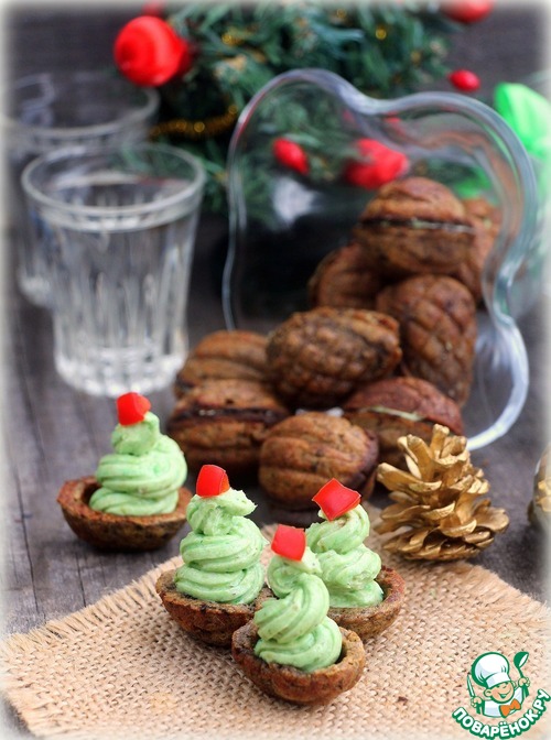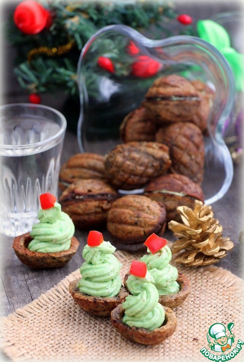 Каждую половинку орешка заполнить готовым паштетом, в середину вставить половинку маслина и закрыть второй половинкой орешка.