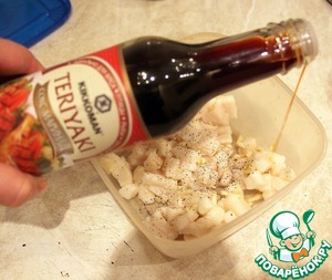 Добавить 1 ч. л. соевого соуса-маринада Терияки ТМ "Киккоман", поперчить, перемешать. Оставить при комнатной температуре на ночь, затем на сутки убрать в морозилку.