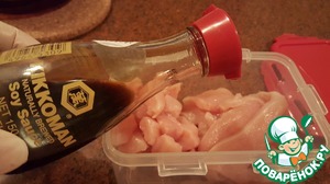 Выложить кусочки грудки в контейнер, добавить соевый соус Киккоман классический.