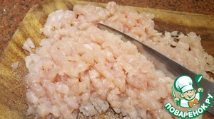 Оставшуюся грудку порубить ножом на фарш. Если Вы готовите на большую компанию, проверните куриное мясо в мясорубке с крупной сеткой.