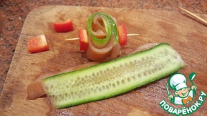 Зафиксировать зубочисткой и одеть по бокам квардатики болгарского перца.